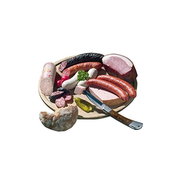 Inhalt: Weißwürste, Käsekrainer, Bayrischer Leberkäse, Bauernschwarzwurst, Rohpolnische, roher Schinken und Zwiebelwurst.
