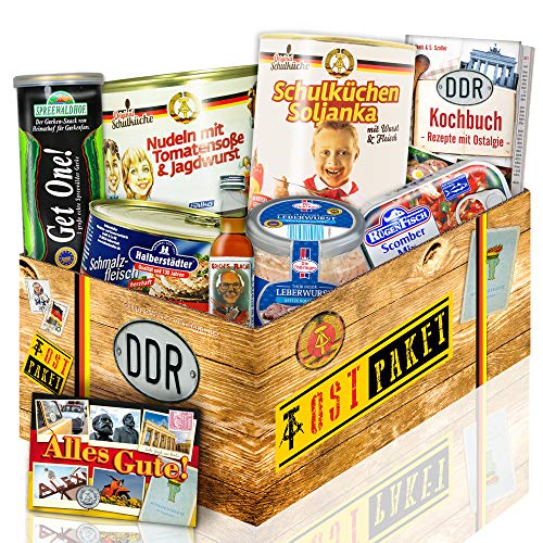 OSTPRODUKTE: Schulküche-Nudeln mit Tomatensoße & Jagdwurst 500g Dose, Soljanka Dose 800g, Leberwurst 130g im Glas, Scomber MIX Rügenfisch 120g, Halberstädter Schmalzfleisch, Gurken Snack Get One aus dem Spreewald, Erichs Rache Likör 40ml, DDR Kochbuch-Rezepte mit Ostalgie inkl. Geschenkverpackung (wiederverschließbar).