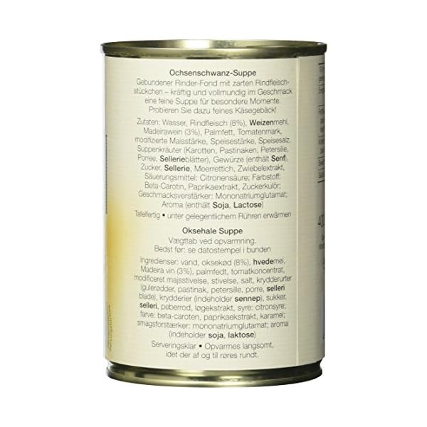 Zutaten: Wasser, Rindfleisch (8%), WEIZENmehl, Madeirawein (3%), Palmfett, Tomatenmark, modifizierte Maisstärke, Speisestärke, Speisesalz, Suppenkräuter (Karotten, Pastinaken, Petersilie, Porree, SELLERIEblätter), Gewürze (enthält SENF), Zucker, SELLERIE, Meerrettich, Zwiebelextrakt, Säuerungsmittel Citronensäure, Farbstoff: Beta-Carotin, Paprikaextrakt, Zuckerkulör; Geschmacksverstärker: Mononatriumglutamat; Aroma (enthält SOJA, LACTOSE)