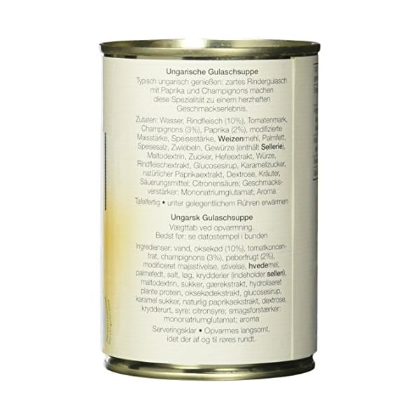 Zutaten: Wasser, Rindfleisch (10%), Tomatenmark, Champignons (3%), Paprika (2%), modifizierte Maisstärke, Speisestärke, WEIZENmehl, Palmfett, Speisesalz, Zwiebeln, Gewürze (enthält SELLERIE), Maltodextrin, Zucker, Hefeextrakt, Würze, Rindfleischextrakt, Glucosesirup, Karamellzucker, natürlicher Paprikaextrakt, Dextrose, Kräuter, Säuerungsmittel: Citronensäure; Geschmacksverstärker: Mononatriumglutamat; Aroma