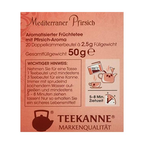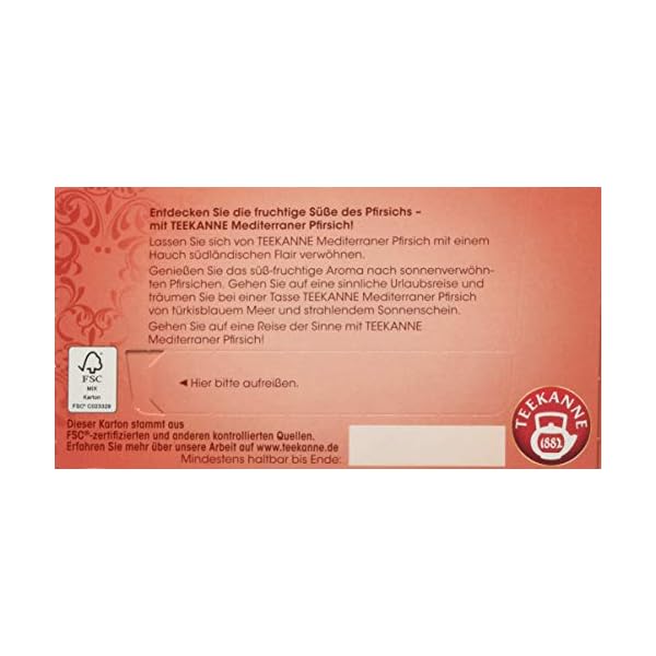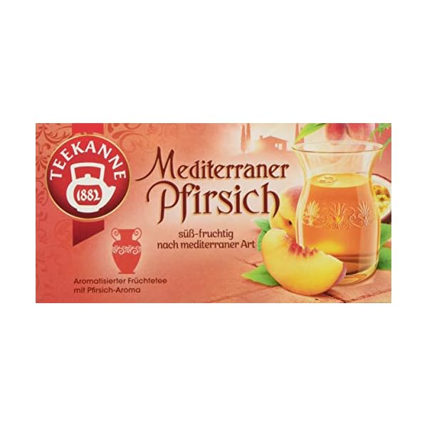 Entdecken Sie die fruchtige Süße des Pfirsichs – mit TEEKANNE Mediterraner Pfirsich! Lassen Sie sich von TEEKANNE Mediterraner Pfirsich mit einem Hauch südländischen Flair verwöhnen. Genießen Sie das süß-fruchtige Aroma nach sonnenverwöhnten Pfirsichen. Gehen Sie auf eine sinnliche Urlaubsreise und träumen Sie bei einer Tasse TEEKANNE Mediterraner Pfirsich von türkisblauem Meer und strahlendem Sonnenschein. Gehen Sie auf eine Reise der Sinne mit TEEKANNE Mediterraner Pfirsich!
